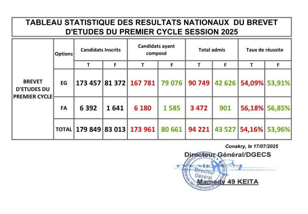 Le Ministère de l’Éducation nationale et de l’Alphabétisation de la République de Guinée a publié ce jeudi 17 juillet 2025, via sa page Facebook officielle, les statistiques officielles des résultats du Brevet d’Études du Premier Cycle (BEPC), session 2024-2025.