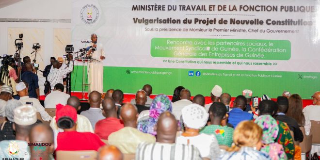 Dans le cadre de la campagne nationale de vulgarisation du projet de nouvelle Constitution, une rencontre d’envergure s’est tenue à Conakry, sous la présidence du Premier Ministre Amadou Oury BAH, Amadou Oury BAH, avec les partenaires sociaux.