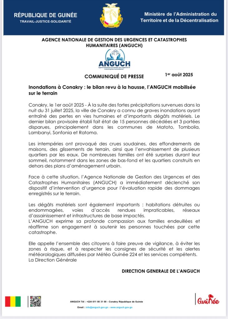 C’est à travers un communiqué de l’ANGUCH publié ce vendredi 1er août 2025 que le dernier bilan provisoire établi a été annoncé. Selon le tableau, au moins 15 personnes sont décédées et 3 portées disparues suite au grave inondations dans la ville de Conakry ainsi que d’importants dégâts materiels enregistrés.