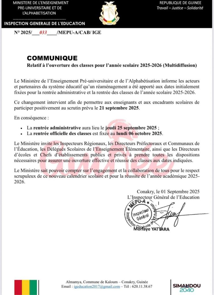 Guinée/Éducation : la rentrée des classes de l’année scolaire 2025-2026 décalée au lundi 6 octobre 2025
