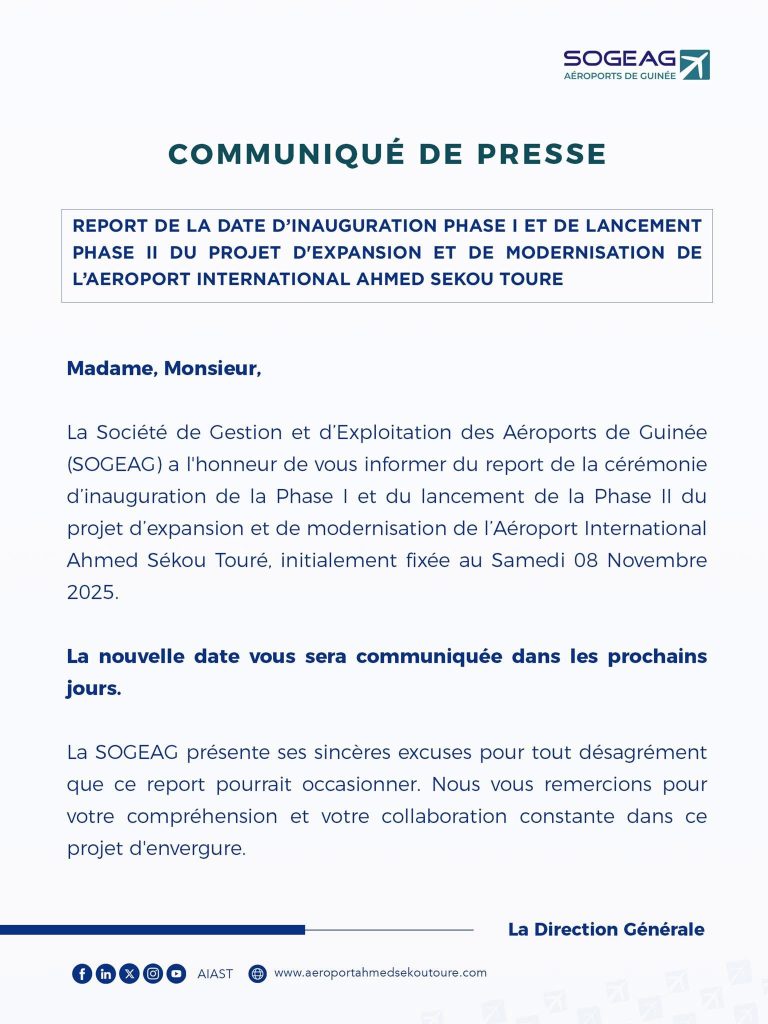 À travers un communiqué publié ce vendredi 7 novembre 2025, la Société de Gestion et d’Exploitation des Aéroports de Guinée (SOGEAG) a annoncé le report de la date de l’inauguration phase 1 et le lancement phase 2 du projet d’expansion et modernisation de l’aéroport international Ahmed Sékou Touré.