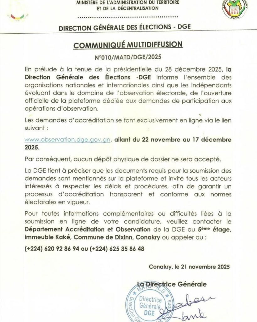 Selon le communiqué de la DGE, les documents requis pour la soumission des demandes sont mentionnés sur la plateforme et invite tous les acteurs intéressés à respecter les délais et procédures, afin de garantir un processus d’accréditation transparent et conforme aux normes électorales en vigueur.