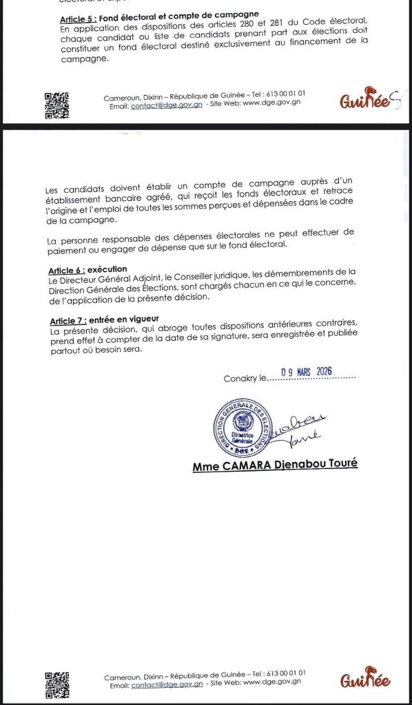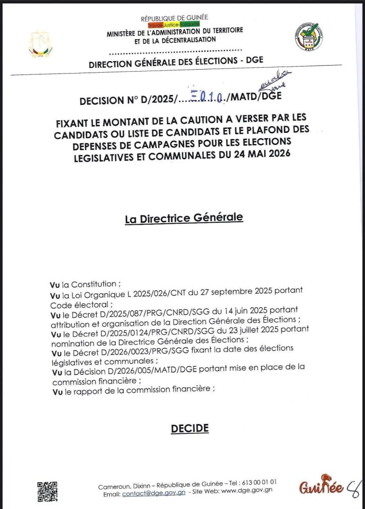 Guinée / Élections législatives et communales : La DGE fixe le montant de la caution à verser par les candidats ou liste de candidats