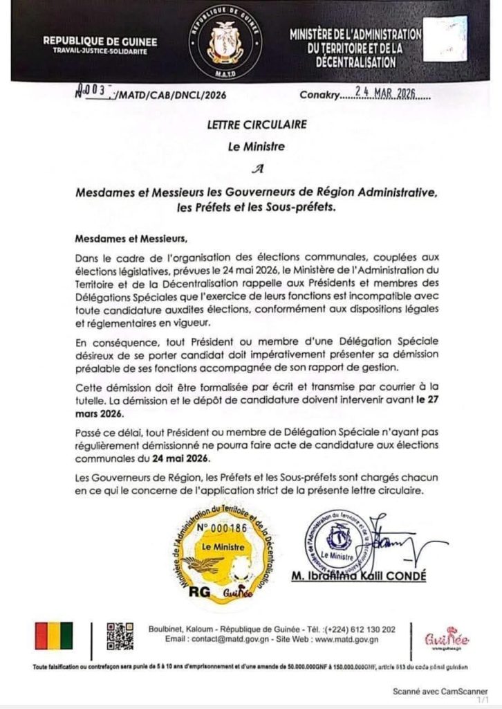 À travers une lettre circulaire, le Ministre de l’Administration du Territoire et de la Décentralisation Ibrahima Kalil Condé a rappelé les présidents et membres des délégations spéciales qui souhaitent se porter candidat aux élections communales, couplées aux élections législatives de démissionner de leurs fonctions et présenter leurs rapports de gestion au département de tutelle avant le 27 mars prochain.