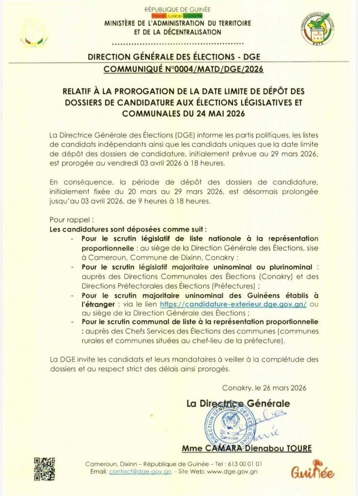 Initialement prévue au 29 mars 2026, la Direction Générale des Élections a annoncé ce jeudi 26 mars 2026 à travers un communiqué, la prorogation de la date limite de dépôt des dossiers de candidature aux élections législatives et communales du 24 mai 2026.