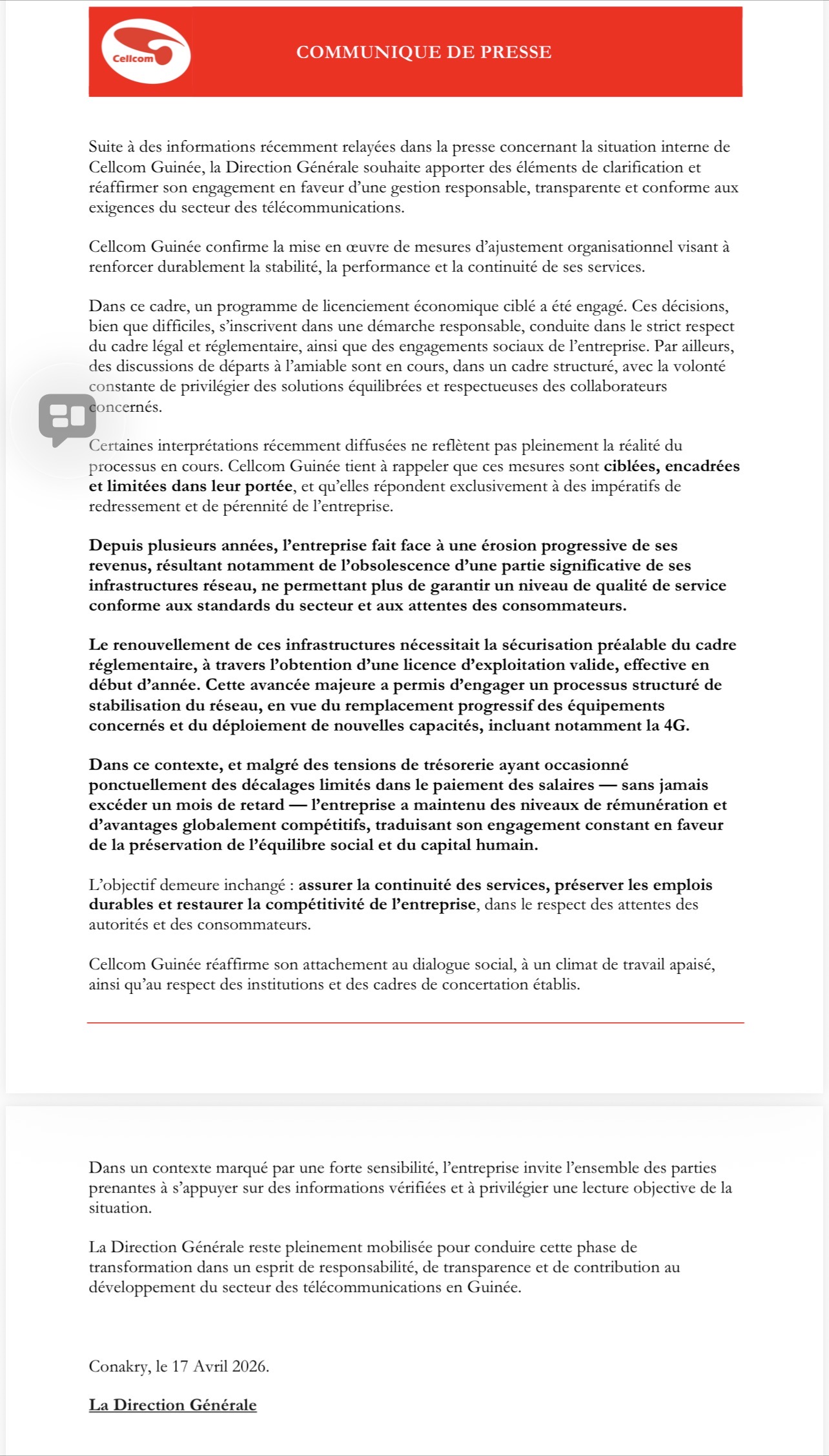 Après la diffusion de certaines informations sur les différents canaux, la Direction Générale de Cellcom Guinée a apporté ce lundi 20 avril 2026 à travers un communiqué, des éléments de clarification concernant la gestion de ladite société de téléphonie mobile.