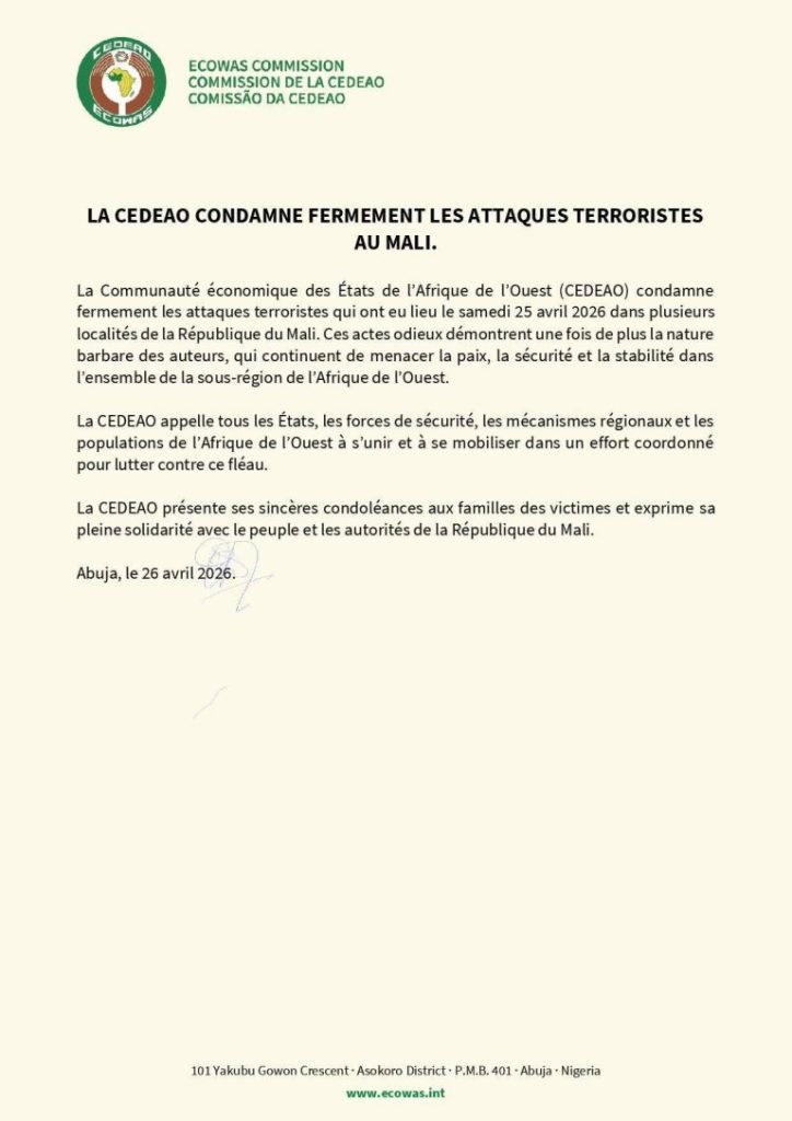 La CEDEAO a fermement condamné ce dimanche 26 avril 2026 à travers un communiqué, les attaques terroristes meurtrières du 25 avril 2026 au Mali, incluant la mort du ministre de la Défense.
